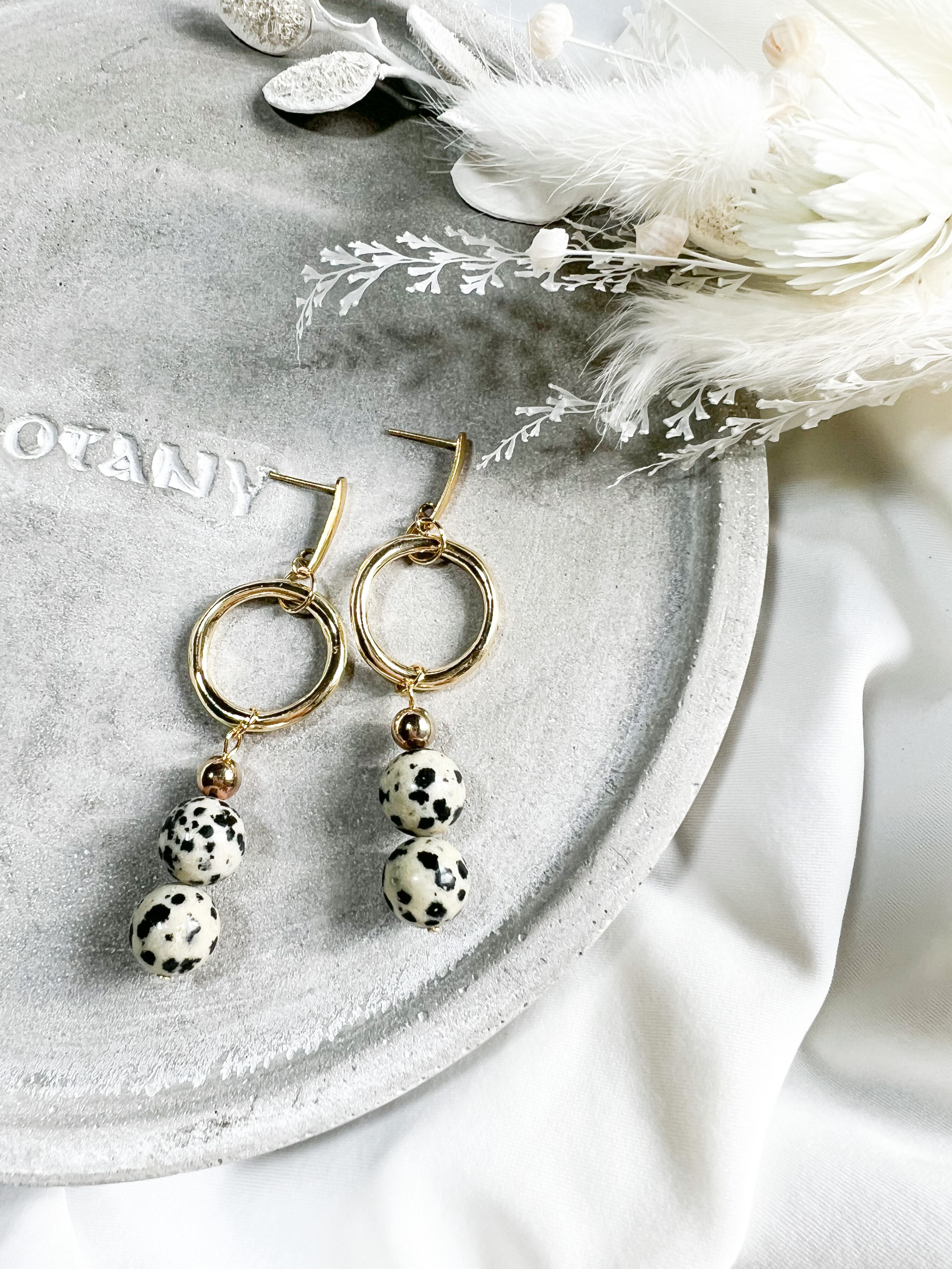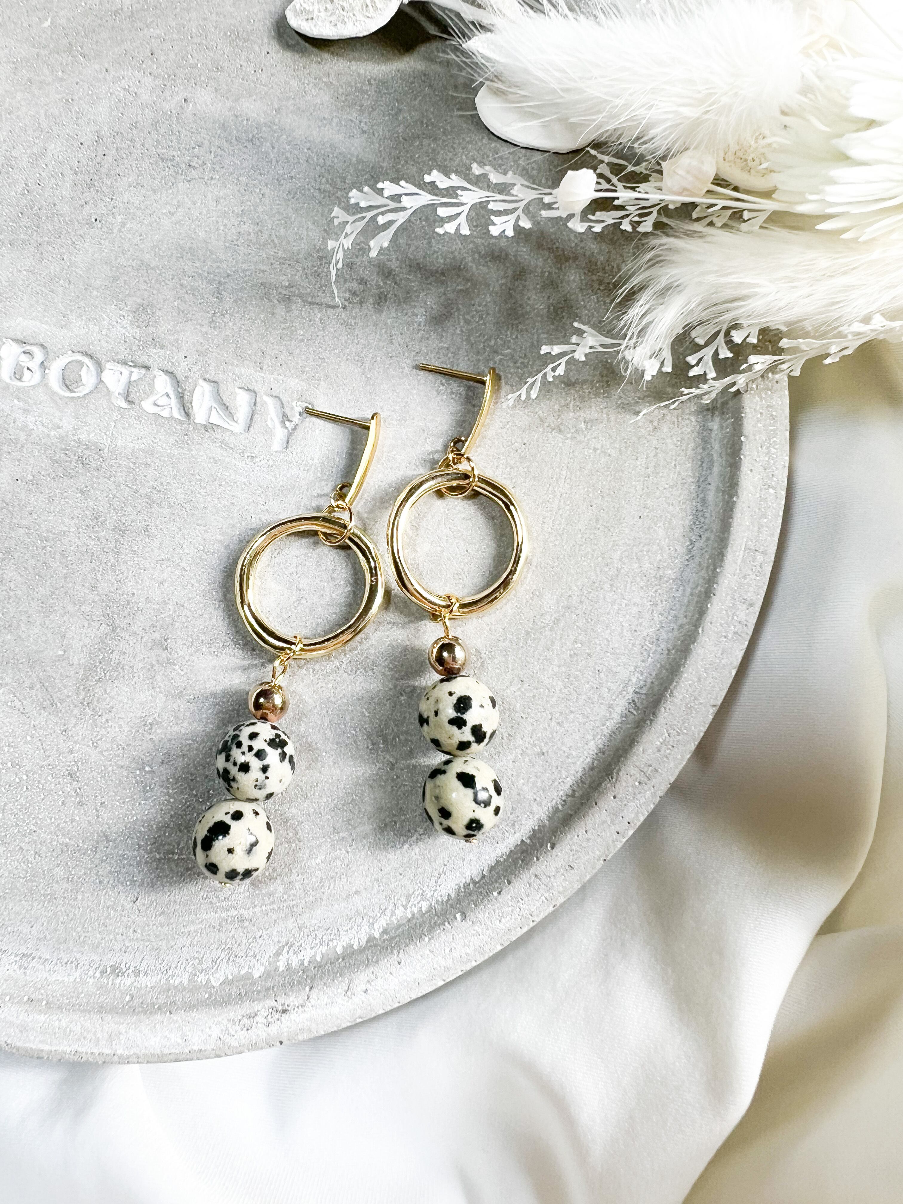 ダルメシアンのチャームと縦長のデザインピアスとの